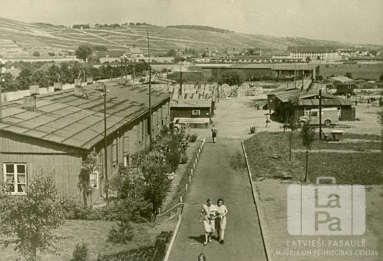 Skats no augšas uz Rietumu nometni Vircburgā (amerikāņu zonā). Vienstāvu koka barakas, pa ielu pastaigājas cilvēki. Fonā ir pauguraina ainava ar vīnogu laukiem.