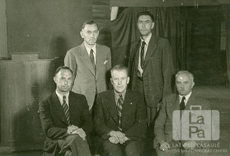 Rietumu nometnes Vircburgā (amerikāņu zonā) vadība sēž divās rindās iekštelpās. Pieci vīrieši ir ģērbušies uzvalkos, priekšējā rinda sēž uz krēsliem. Fonā kreisajā pusē, iespējams, ir katedra. Priekšā, otrais no kreisās: ? Duncēns.
