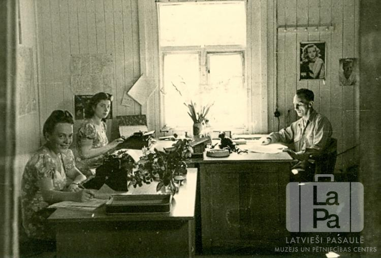 Rietumu nometnes Vircburgā (amerikāņu zonā) komandanta birojs. Divas sievietes un vīrietis strādā pie rakstāmgaldiem. Sievietēm priekšā ir rakstāmmašīnas. Fonā ir logs. Pirmais no labās: ? Frenk (organizācijas "United Nations Relief and Rehabilitation Administration" nometnes komandants).