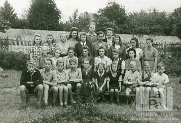 Pamatskolas un ģimnāzijas audzēkņi Rietumu nometnē Vircburgā (amerikāņu zonā) 1945.–1946. mācību gadā. Tā kā šajā nometnē nebija latviešu skolas, skolēni tika katru dienu ar smagajām armijas automašīnām vesti uz Centrālo nometni Vircburgā, kur bija latviešu skolas. Skolēni vairākās rindās, pirmā rinda sēž uz soliem. Priekšā aug zems krūms. Fonā ir žogs un koki. Trešajā rindā, pirmā no labās: Velta Jaunzema (pr. Kalēja).