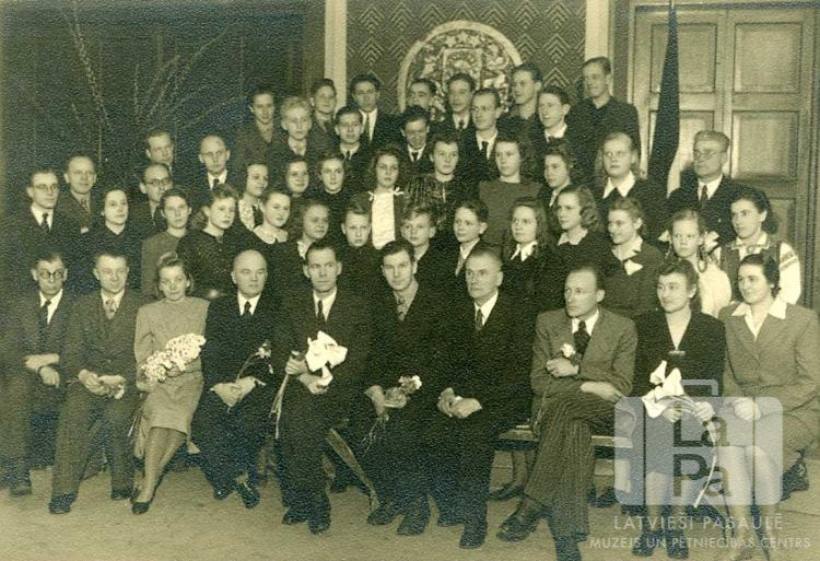 Skolotāji un skolēni pamatskolas izlaidumā Centrālajā nometnē Vircburgā (amerikāņu zonā). Cilvēku grupa vairākās rindās. Pirmajā rindā uz koka sola sēž skolotāji; vairākiem skolotājiem rokās ir ziedi. Fonā pie sienas ir Latvijas Valsts ģerbonis, karogs un koka durvis. Pirmajā rindā, no kreisās: ? Ozoliņš, nezināms, A. Dravniece, J. Bormanis, J. Pļaviņš, ? Klarks (nometnes priekšnieks), ? Zālītis, G. Salnais, ? Lietuviete un B. Bole. Otrajā rindā, pirmais no kreisās: Vilis Pētersons. Trešajā rindā, no kreisās: otrais Fricis Sīpols (ar brillēm), ceturtā Velta Jaunzema (pr. Kalēja) un vienpadsmitais ? Āboliņš. Ceturtajā rindā, no kreisās: pirmais Jānis Deglis, otrais ? Muižnieks.