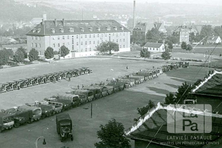 Garas automašīnu rindas Ziemeļu nometnes laukumā Vircburgā (amerikāņu zonā). Iespējams, tās ir armijas transporta tehnikas vienības – kravas un vieglās automašīnas. Gar automašīnām pastaigājas cilvēki. Aiz laukuma ir trīsstāvu mūra ēka un citas ēkas. Fonā ir pauguraina ainava. Skats no augšas.