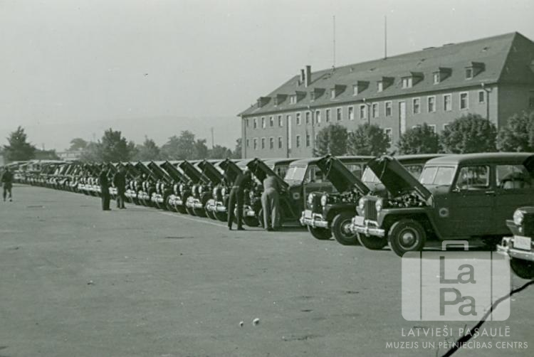 Gara automašīnu rinda Ziemeļu nometnes laukumā Vircburgā (amerikāņu zonā). Automašīnām ir pacelti motoru pārsegi. Vairāki cilvēki staigā gar mašīnām un tās pēta. Fonā ir trīsstāvu mūra ēka.