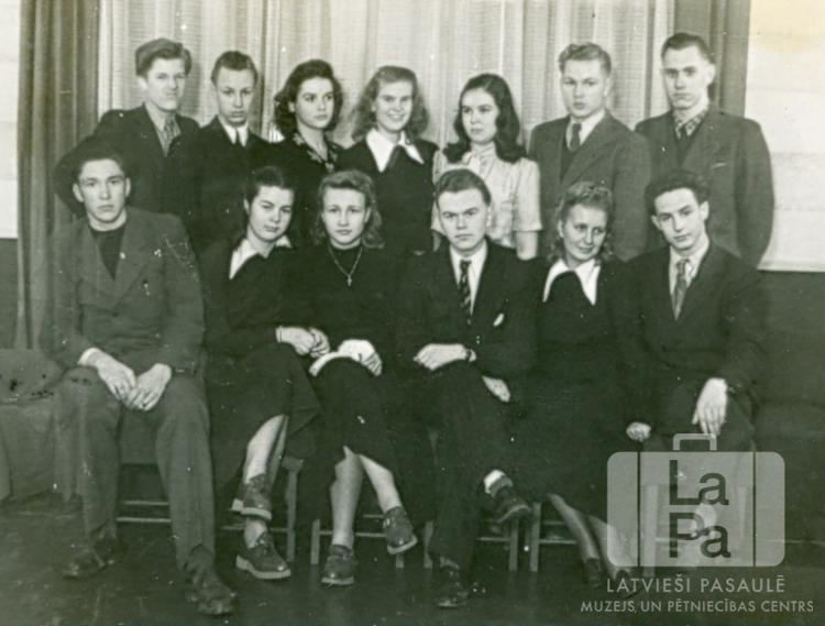 Kristīgo jauniešu grupa Vircburgā (amerikāņu zonā). Jaunieši divās rindās iekštelpās; pirmā rinda sēž uz krēsliem. Fonā ir aizkars. Pirmajā rindā, no kreisās: Guntis Kuškēvics, Aira Vallis, Raita Eglīte (pr. Brunovska), Juris Bormanis, Vija Mezīte un Arvīds Ziedonis. Otrajā rindā, no kreisās: Vilnis Ciemiņš, Vilnis Jākabsons, Maija Ķiploka, Gaida Āboliņa, Velta Jaunzema (pr. Kalēja), Ziedonis Cakars un ? Smiltiņš.