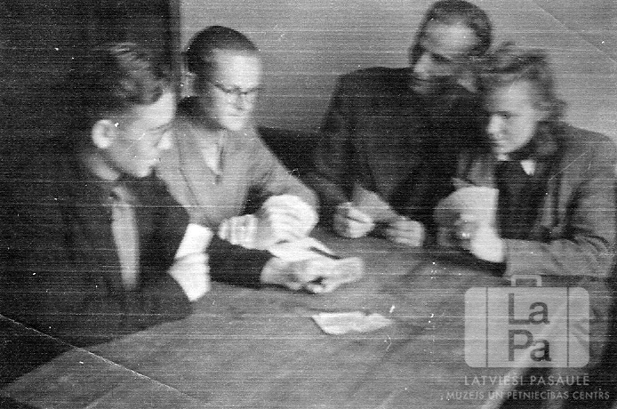 Četri cilvēki pie koka galda spēlē kāršu spēli "Zole" iekštelpās Dīpholcas nometnē (angļu zonā). Cilvēkiem rokās un uz galda ir kārtis. Pirmais no kreisās: Viesturs Šķidra (?).