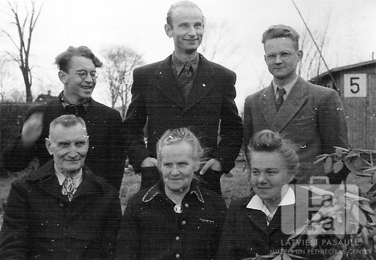 Sešu cilvēku ģimene no Omstedes nometnes 3. barakas Oldenburgā (angļu zonā) 1947. gada Lieldienās. Četri vīrieši un divas sievietes divās rindās; priekšējā rinda sēž. Fonā labajā pusē ir vienstāvu koka baraka, uz kuras ir cipars "5". Pirmajā rindā, no kreisās: Pēteris Černavskis, Anna Černavska un Mirdza Sirone. Otrajā rindā, no kreisās: Viesturs Šķidra, Paulis Černavskis un Oskars Lukstiņš.