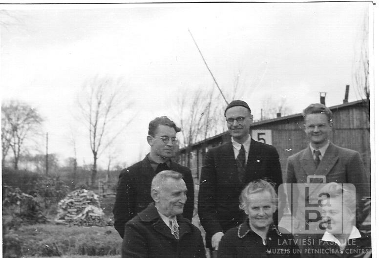 Sešu cilvēku ģimene no 3. barakas Omstedes nometnē Oldenburgā (angļu zonā) 1947. gada Lieldienās. Četri vīrieši un divas sievietes divās rindās; priekšējā rinda sēž. Fonā ir sakrautas malkas kaudze, koki bez lapām un vienstāvu koka baraka, uz kuras ir cipars "5". Pirmajā rindā, no kreisās: Pēteris Černavskis, Anna Černavska un Mirdza Sirone. Otrajā rindā, no kreisās: Viesturs Šķidra, Paulis Černavskis un Oskars Lukstiņš.