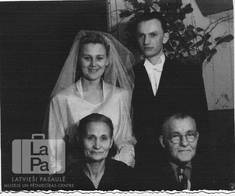 Jaunlaulātie un līgavas vecāki Imanta Skaubīša un Ainas Osis kāzu dienā Omstedes nometnē Oldenburgā (angļu zonā). Priekšā sēž vecāks pāris; līgava gaišā kāzu kleitā un līgavainis uzvalkā stāv aizmugurē. Fonā pie gaišas koka dēļu sienas ir piestiprināts dekoratīvs zars. Priekšā, no kreisās: Karlīna Osis un Heinrihs Osis. Otrajā rindā, no kreisās: Aina Osis un Imants Skaubītis.