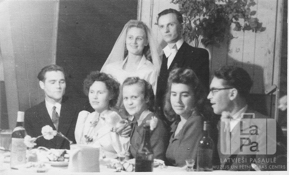 Jaunlaulātie ar viesiem Imanta Skaubīša un Ainas Osis kāzu dienā Omstedes nometnē Oldenburgā (angļu zonā). Priekšā kāzu viesi sēž pie svētku galda, uz kura ir ēdienu trauki, dzērienu pudeles un ziedi. Aizmugurē stāv jaunais pāris. Fonā aiz pāra pie gaišas koka dēļu sienas ir piestiprināts dekoratīvs zars. Priekšā, no kreisās: Džems Krogzems, nezināms, Skaidrīte Svinne, Baiba Freidenfelde un Viesturs Šķidra. Aizmugurē, no kreisās: Aina Osis un Imants Skaubītis.