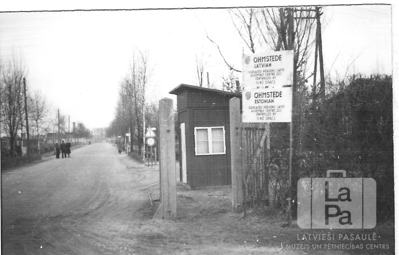 Iebrauktuve Omstedes nometnē Oldenburgā (angļu zonā). Priekšā ir ieejas vārti un nometnes zīme, uz kuras augšpusē ir rakstīts: "OHMSTEDE / LATVIAN / DISPLACED PERSONS CAMP / ASSEMBLY CENTRE 223 / CONTROLLED BY / 11/40 DPACS". Zemāk ir identisks teksts, tikai aizvietojot "LATVIAN" ar "ESTONIAN". Aiz vārtiem ir sargu būda un galvenā nometnes iela, pa kuru pastaigājas cilvēki.