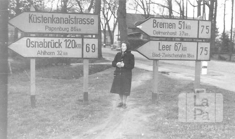 Hermīne Viškere stāv pie ceļa zīmēm Oldenburgā (angļu zonā). Ceļa zīmes norāda uz vairākām vietām, tostarp "Küstenkanalstrasse", "Osnabrück", Bremen" un "Leer". Fonā ir iela ar braucošu vieglo automašīnu, koki un mazstāvu ēku. Foto autors: Ēvalds Viškers.