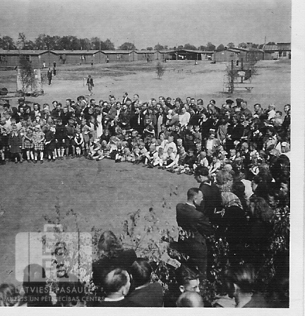 Cilvēku pūlis pusaplī klausās nometnes komandanta Kirila Viduča uzrunu bērnu svētkos Omstedes nometnē Oldenburgā (angļu zonā). Runātājs nav redzams. Fonā ir plašs laukums un zemas vienstāvu koka barakas.