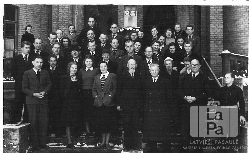 Luterāņu Vispasaules federācijas studiju centra kursu dalībnieki stāv uz Imbshausenes mūra pils kāpnēm (angļu zonā). Centru vadīja Prof. Edmunds Šmits, administrators bija mācītājs Gustāvs Knezs-Kneziņķis.
