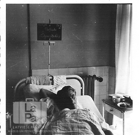 Valfrīds Spuntelis Pinnebergas slimnīcā (angļu zonā) pēc ievainojuma vēderā šķēpa mešanas treniņā. Jaunietis pārcieta četras operācijas un pamazām atveseļojās. Gultas kreisajā pusē ir mazs galds ar ēdiena šķīvi un dzēriena krūzi. Gultas galvgalī ir zīme ar pacienta vārdu un uzvārdu.