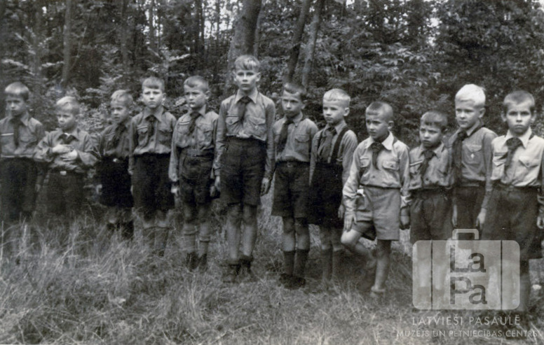 Tālavas 79. skautu vienības mazskauti no Rēgensburgas nometnes (amerikāņu zonā) formastērpos stāv meža malā. Grupā nav pirmnieki, kuri pārgāja uz skautiem. Fonā ir Burgveitingas mežs ("Burgweinting").