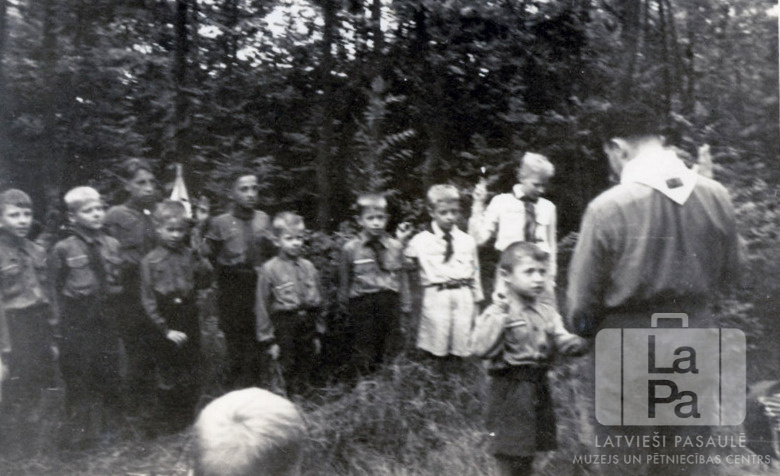 Tālavas 79. skautu vienības mazskauts no Rēgensburgas nometnes (amerikāņu zonā) dod mazskauta solījumu Burgveitingas mežā ("Burgweinting"): "Centīšos visiem spēkiem: klausīt Dievam, vecākiem un mazskautu likumiem, arvien darīt labos darbus." Mazskauts kopā ar vadītāju stāv priekšā, labajā pusē. Aizmugurē stāv skauti, daži ir pacēluši roku. Priekšā, otrais no labās: Imants Ikerts (mazskauts).