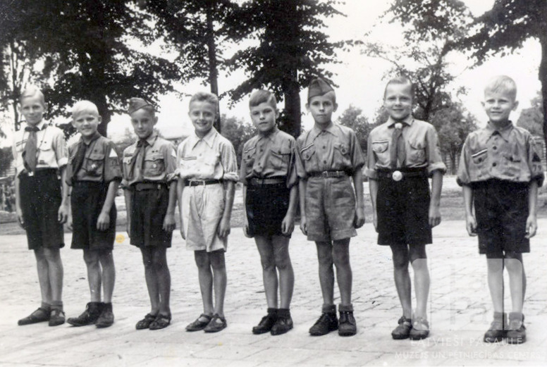 Rēgensburgas nometnes (amerikāņu zonā) Tālavas 79. skautu vienības mazskauti formastērpos stāv ierindā. Fonā ir koku rinda. Pirmais no kreisās: Viesturs Žagars.