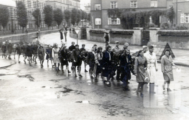 Tālavas 79. skautu un Tālavas 76. gaidu vienības gājiens Regensburgā (amerikāņu zonā). Cilvēki ar vainagiem rokās soļo lietainā dienā pa asfaltētu pilsētas ielu. Fonā ielas malās ir vairākstāvu mūra ēkas un koku rinda.
