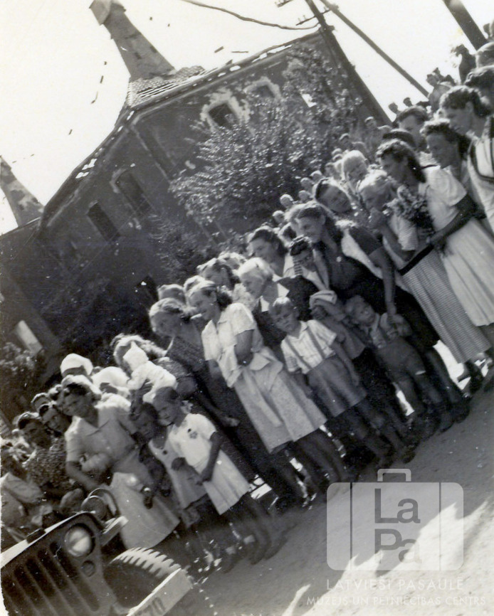 Atvadīšanās no Rēgensburgas nometnes (amerikāņu zonā) nometnes komandanta, pulkveža ? Cariton. Cilvēku pūlis noskatās garāmbraucošā automašīnā. Priekšplānā kreisajā pusē ir redzama automašīnas priekšdaļa (iespējams, "Willys MB Jeep" markas auto). Fonā ir divstāvu mūra ēka.
