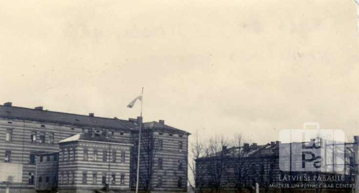 Divas trīsstāvu mūra kazarmas Rēgensburgas nometnē (amerikāņu zonā) ziemas laikā. Gar ēkām ir bezlapu koku rinda. Priekšplānā ir Latvijas Valsts karogs masta galā.