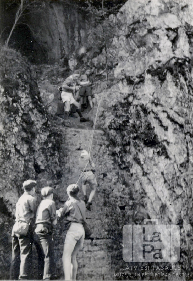 Tālavas 79. skautu vienība no Rēgensburgas nometnes (amerikāņu zonā) veic ievainotā glābšanu skautu sirojuma laikā. Priekšā trīs puiši tur auklu, uz kuras turās skauts, kas tiek laists lejā no klints. Klints augšpusē auklu tur divi skauti. Visi ir ģērbušies formastērpos.