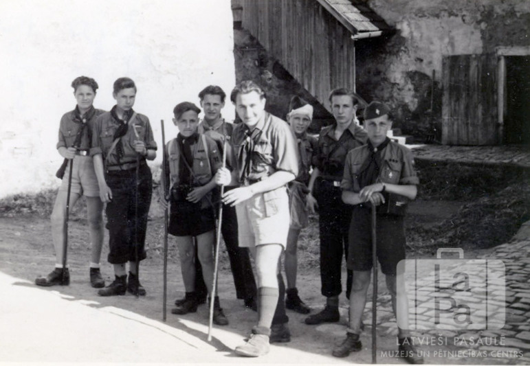 Tālavas 79. skautu vienība no Rēgensburgas nometnes (amerikāņu zonā) ar vadītāju skautu sirojumā Bavārijas ciemā. Vairākiem skautiem rokās ir nūjas; vienam zēnam ir apsaitēta galva. Fonā ir mūra sienas, bruģēta taka, atvērtas koka durvis un segtas koka trepes uz augšu. Sestais no kreisās: Viesturs Žagars (ar apsaitētu galvu).
