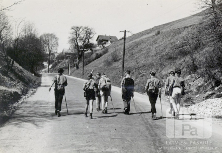 Tālavas 79. skautu vienība no Rēgensburgas nometnes (amerikāņu zonā) ar vadītāju skautu sirojumā dodas pa ceļu uz Pīlendorfu. Skauti formastērpos ar mugurām pret fotogrāfu; vairākiem rokās ir nūjas. Vienam zēnam ir apsaitēta galva. Abpus ceļam ir nogāzes; fonā labajā pusē nogāzes augšpusē ir ēkas. Ceturtais no kreisās: Viesturs Žagars (ar apsaitētu galvu).