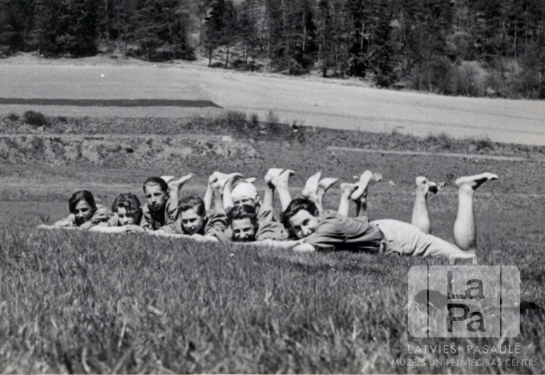 Tālavas 79. skautu vienība no Rēgensburgas nometnes (amerikāņu zonā) atpūtina kājas skautu sirojuma laikā. Jaunekļi guļ pļavā uz vēdera, ar paceltām kājām. Vienam zēnam ir apsaitēta galva. Fonā ir lauks un mežs. Sestais no kreisās: Viesturs Žagars (ar apsaitētu galvu).