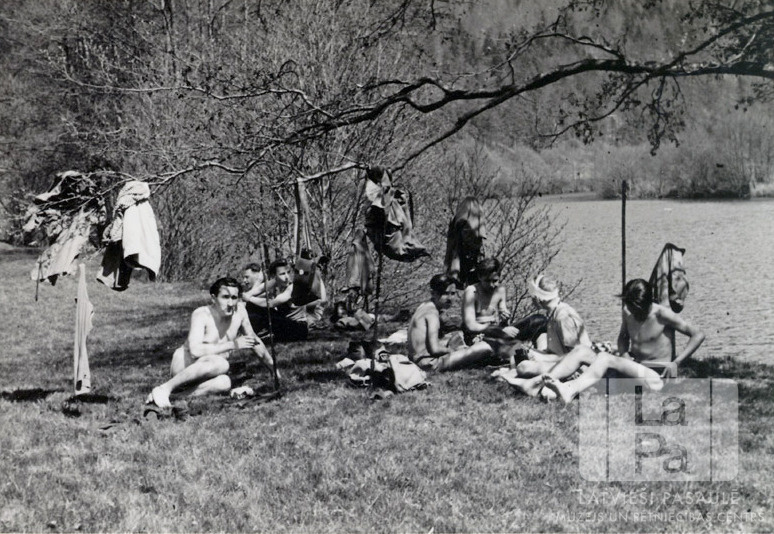 Tālavas 79. skautu vienība no Rēgensburgas nometnes (amerikāņu zonā) atpūšas zālē blakus Donavas upei, skautu sirojuma laikā arī peldoties. Vienam zēnam ir apsaitēta galva. Puišu drēbes guļ uz zemes un ir pakārtas koku zaros. Fonā upes krastā ir mežs. Otrais no labās: Viesturs Žagars (ar apsaitētu galvu).