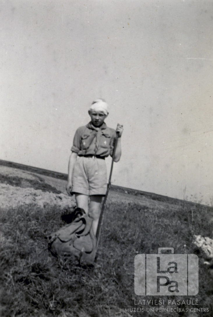 Tālavas 79. skautu vienības skauts Viesturs Žagars no Rēgensburgas nometnes (amerikāņu zonā) ar apsaitētu galvu skautu sirojuma laikā stāv zālē. Puisim formastērpā rokās ir nūja. Priekšplānā uz zemes ir soma. Fonā, iespējams, ir pļava.