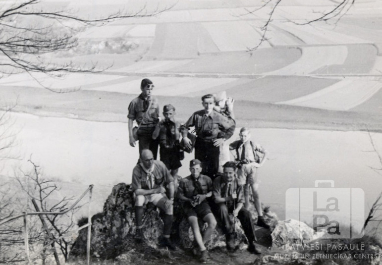Tālavas 79. skautu vienība no Rēgensburgas nometnes (amerikāņu zonā) stāv uz klints skautu sirojuma sākumā. Skauti ar vadītājiem formastērpos. Fonā, iespējams, ir Donavas upe ar plašiem, līdzeniem laukiem otrā krastā. Skats no augšas. Priekšā, pirmais no kreisās: Mazvagalis (vadītājs).
