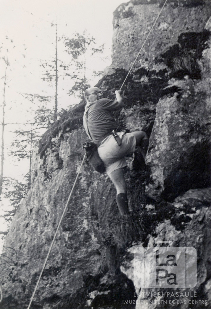 Rēgensburgas nometnes (amerikāņu zonā) Tālavas 79. skautu vienības vadītājs ? Mazvagalis skautu sirojuma laikā demonstrē, kā pa virvi var nolaisties lejā no klints. Vīrietis ir ģērbies formastērpā, ar pie biksēm piestiprinātu somu un nazi. Fonā ir redzams uz klints augošs mežs.