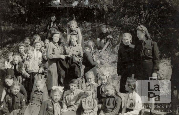 Liepavota 3. gaidu vienības guntiņas no Mēsenes nometnes Lībekā (angļu zonā) novada nometnē Timmendorfā 1948. gada vasarā. Meitenes formastērpos stāv un sēž uz nelielas nogāzes. Grupas vidū, kreisajā pusē, ir redzamas stāvam, no kreisās: – priekšā pirmā Vija Blumfelde (pr. Mangule) un otrā Vija Bangerska; otrajā rindā: Baiba Sidraba (aiz Vijas Bangerskas).