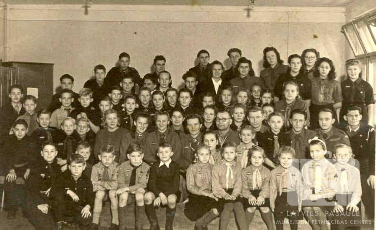 Staburaga 1. skautu vienība un Liepavota 3. gaidu vienība Mēsenes nometnē Lībekā (angļu zonā). Liela bērnu grupa vairākās rindās iekštelpās. Fonā kreisajā pusē ir skapis, bet labajā pusē ir logs. Grupas vidū ir redzami: Olga Medeniece (vadītāja) un Jūlijs Medenieks (vadītājs). Grupā vēl ir redzami: Līvija Raudzēna, Guna Aistere, Marģeris Raudzēns, Imants Kalniņš, Edvarts Abermanis, Arnis Abermanis, Vija Bangerska, Biruta Bērziņa, Ausma Tolēna, Rolands Dzelve, Arvīds Timermanis, Ruta Sidraba, Līga Drulle, Viktors Millers, Lija un Maija Čūles, Edīte Balode, Aina Prauliņa, Vija Blumfelde (pr. Mangule), Marija Jesčenko, Biruta Mikus, Rolands Neijs, Indriķis Kaņeps, Arnis Zēbergs, Uldis Lapiņš, Biruta Saliņa, ? Palks, Līvis Dzelve, Juris Blumfelds, Ivars Medenieks, Sandris Štūbelis, Emīls Elstiņš, Gunārs Drulle, Ligita Branta, Tija Andrīte, Silvija Bergā, Ilga Jurēviča, Ingrīda Larsone, Inta un Dzidra Ezītes, Vita Grundmane, Milda un Maija Ķepītes, Beatrise Eglāja, Ilga Vecvagare un ? Gredzens (vadītājs).