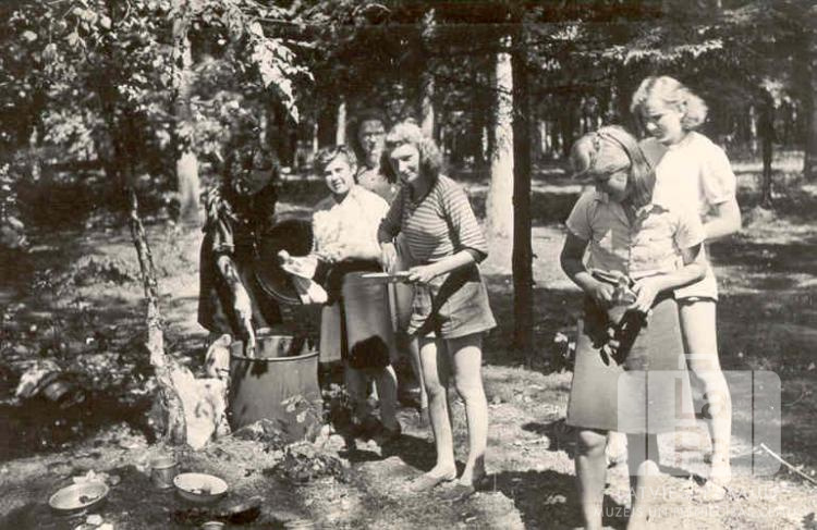 Liepavota 3. gaidu vienības lielgaidas no Mēsenes nometnes Lībekā (angļu zonā) 1948. gada vasarā mežā mazgā pusdienu traukus. Jaunietes stāv pie liela katla; vairākām rokās ir galda piederumi. No kreisās: pirmā Marija Jescenko, trešā Ārija Dāboliņa un piektā Māra Dickale.