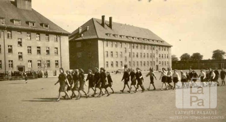 Liepavota 3. gaidu vienība no Mēsenes nometnes Lībekā (angļu zonā) formastērpos soļo pāri laukumam Sv. Jura dienas parādē. Fonā ir divas trīsstāvu mūra ēkas; pie vienas no ēkām ir cilvēku pūlis.