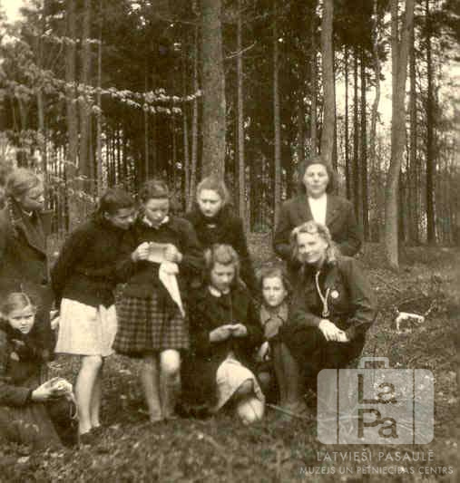 Liepavota 3. gaidu vienības lielgaidas no Mēsenes nometnes Lībekā (angļu zonā) 1948. gada vasarā ar vadītāju veic uzdevumu šķēršļu gājiena laikā mežā. Viena meitene tur mazu lapu ar norādījumiem. Pirmajā rindā, no kreisās: otrā Vilhelmīne Pelse un trešā Vija Blūmfelde (pr. Mangule; lasa norādījumus) un sestā H. Medne (vadītāja).