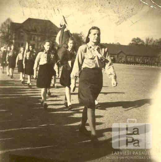 Sidrabenes 21. gaidu vienība no Valderzē nometnes Lībekā Sv. Jura dienas parādē Mēsenes nometnē Lībekā (angļu zonā). Jaunietes formastērpos soļo garā kolonnā; jauniete otrajā rindā nes Latvijas karogu. Fonā ir laukums un vairākas mūra ēkas, kuru priekšā ir citas cilvēku kolonnas. Gājiena priekšgalā soļo Ella Kaņepe (vadītāja).