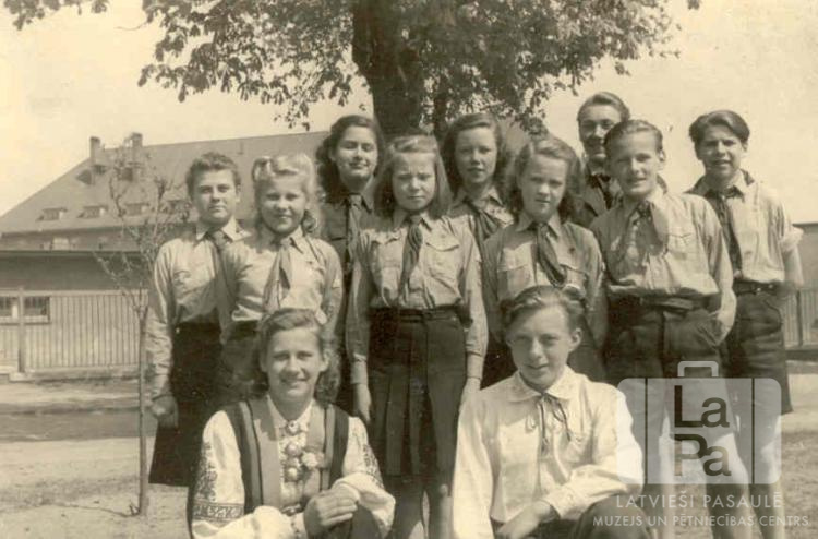 Sidrabenes 21. gaidu vienība un Talsu 9. skautu vienība no Valderzē nometnes Lībekā (angļu zonā). Jaunieši formastērpos stāv divās rindās; priekšā sēž jauniete un puisis tautastērpos. Fonā ir koks un mūra ēka. Priekšā, no kreisās: Biruta Mikus un Harijs Elvigs. Aizmugurē stāv, no kreisās: Marija Jescenko, Mirdza Linkaite, Ausma Tolēna, nezināms, Vija Blumfelde, Ilona Engele, Verners Krūmiņš, Arnis Mikus un nezināms.