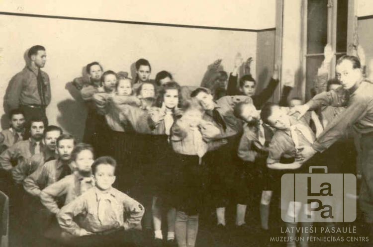 Sidrabenes 21. gaidu vienības gaidas un Talsu 9. skautu vienības skauti vingrošanas nodarbībās Sidrabenes nometnē Lībekā (angļu zonā). Zēni un meitenes stāv vairākās rindās viens aiz otra iekštelpās; kreisajā pusē rinda ir notupusies uz ceļiem. Labajā pusē vīrietis koriģē viena zēna veikto vingrinājumu. Pirmajā rindā no kreisās puses ir redzami: Vilnis Matisons, Druvvaldis Liepiņš, Indulis Liepiņš, Marija Jescenko, Vilhelmīne Pelse. Otrajā rindā no kreisās stāv, no priekšas: pirmā Inese Liepiņa (?), otrā Ilga Nātre (?) un sestā Vija Blumfelde (pr. Mangule). Trešajā rindā no kreisās stāv, no priekšas: trešais Kārlis Riekstiņš un piektā Aina Ošiņa. Ceturtajā rindā no kreisās stāv, otrais no beigām: Guntis Nātre (tumšā kreklā ar paceltām rokām). Kreisajā pusē aizmugurē pie sienas stāv ? Grīnvalds (vadītājs). Labajā pusē, pirmais no labās: Harijs Bergs (vadītājs).