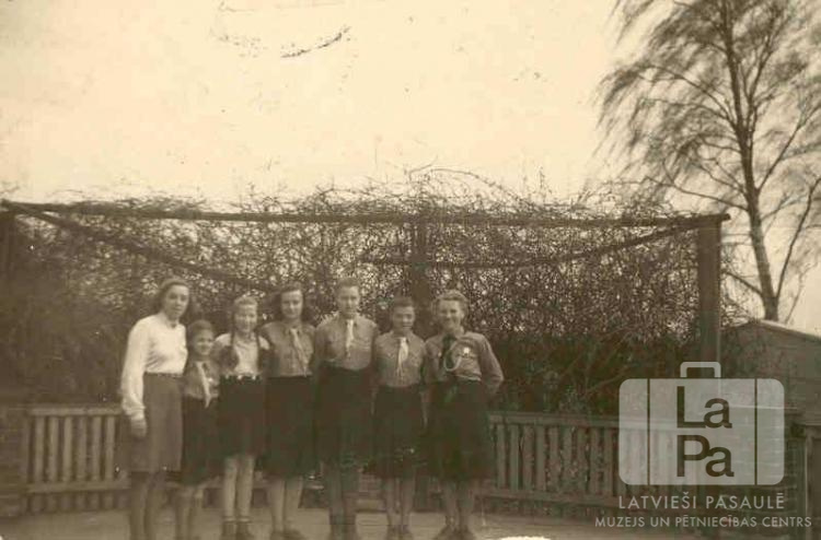 Sidrabenes 21. gaidu vienības kaiju kops no Valderzē nometnes Lībekā (angļu zonā) 1946. gada pavasarī apciemo pacientus latviešu slimnīcā Lībekā. Septiņas gaidas stāv rindā viena otrai blakus, lielākā daļa ir ģērbusies formastērpos. Fonā ir koka žogs un vīteņaugu siena. No kreisās: nezināms, Lija Čūle, Brigita ?, Ilze Ekmane, Aina Ošiņa, Vilhelmīne Pelse un H. Medne (vadītāja).