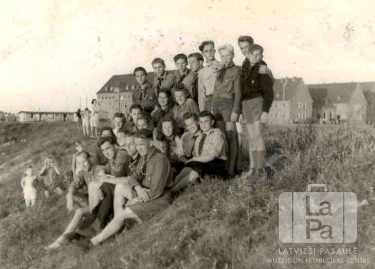 Skauti un gaidas formastērpos sēž uz nogāzes pie Mēsenes nometnes Lībekā (angļu zonā) 1947. gada vasarā Gaujas skautu un gaidu novada kopnieku un kopnieču kursos, kuros piedalījās jaunieši no četrām Lībekas latviešu bēgļu nometnēm. Aizmugurē kreisajā pusē uz nogāzes ir bērni un sieviete. Fonā ir vienstāvu baraka un vairākstāvu mūra dzīvojamās ēkas. Priekšā zālē ir redzami: Harijs Bergs (vadītājs) Ādolfs Artmanis (vadītājs), Biruta Bērziņa (vadītāja), Vija Blūmfelde (pr. Mangule), Biruta Mikus un Marija Jescenko. Otrajā rindā no beigām, no kreisās: Ausma Tolēna un Vija Bangerska.