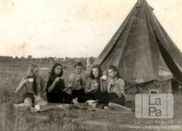 Piecas gaidas formastērpos ietur maltīti telts priekšā pie Mēsenes nometnes Lībekā (angļu zonā) 1947. gada vasarā Gaujas skautu un gaidu novada kopnieku un kopnieču kursos, kuros piedalījās jaunieši no četrām Lībekas latviešu bēgļu nometnēm. Jaunietēm rokās ir krūzes un, iespējams, maize. Jaunietēm priekšā uz segas ir ēdiens. Fonā ir lauks. No kreisās: nezināms, Ausma Tolēna, Marija Jescenko, Vija Blumfelde (pr. Mangule) un Biruta Mikus.