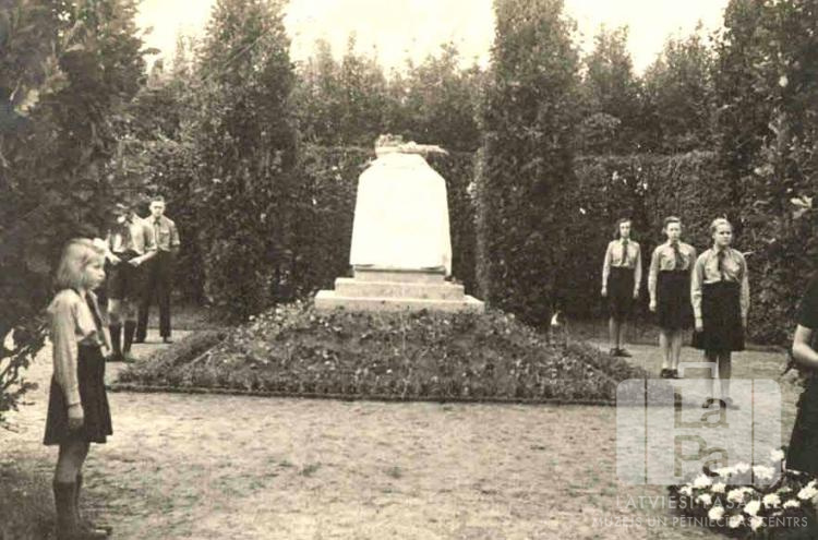 Godasardze kapu svētkos pie mirušo latviešu kopējā pieminekļa "Vorwerk" kapsētā Lībekā (angļu zonā). Šajā pasākumā godasardzē stāv skauti un gaidas no Gaujas skautu un gaidu novada, kurā tika iekļauti jaunieši no četrām Lībekas latviešu bēgļu nometnēm. Jaunieši ir ģērbušies formastērpos. Fonā ir augstas tūjas un dzīvžogi. No kreisās: pirmā Mirdza Linkaite (priekšā), trešais ? Ķiboris (ar garām biksēm), ceturtā Ilze Ekmane, piektā Vija Blumfelde (pr. Mangule), sestā Daina Sudraba.