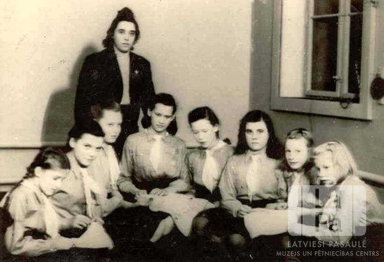 Sidrabenes 21. gaidu vienība nodarbībās Sidrabenes nometnē (Lībekā). Jaunietes formastērpos sēž pusaplī un, iespējams, nodarbojas ar izšūšanu. Aizmugurē stāv jauniete tumšā apģērbā. Labajā pusē ir telpas logs. Priekšā, no kreisās: Lija Čūle, Vilhelmīne Pelše, Aina Ošiņa, Biruta Mikus, Vija Blumfelde (pr. Mangule), Marija Jescenko, Biruta Saliņa un Mirdza Linkaite.
