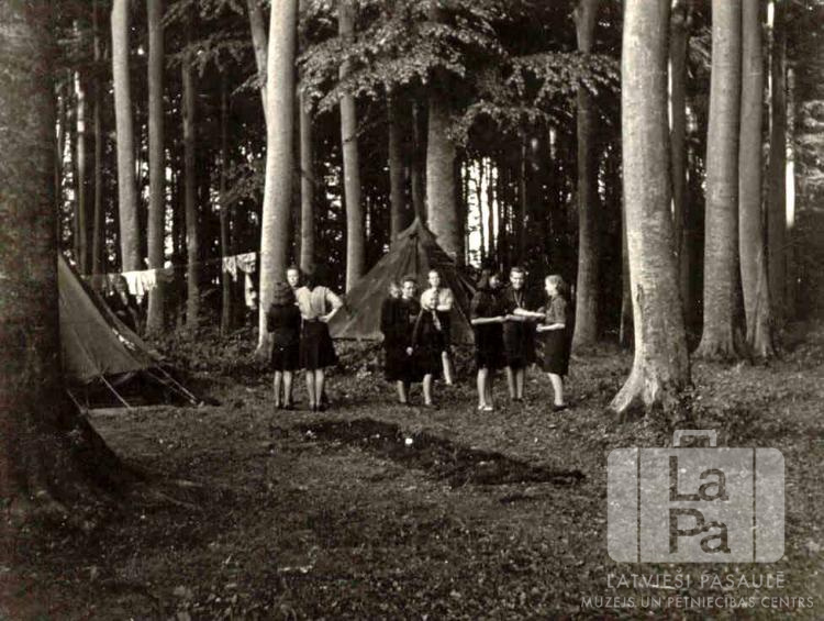 Sidrabenes 21. gaidu vienība no Valderzē nometnes Lībekā (angļu zonā) formastērpos stāv mežā pie teltīm novadu nometnes laikā Timmendorfā. Gaidu priekšā uz zemes ir izklāts tumšs audums. Fonā aiz teltīm uz novilktas auklas karājas drēbes.