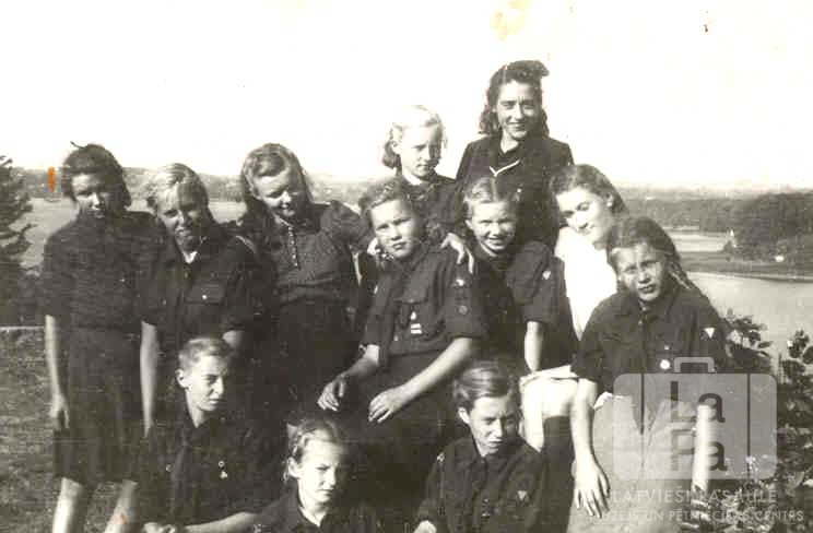 Krimuldas 86. gaidu vienība no Eitīnes nometnes (angļu zonā) pārgājiena laikā. Jaunietes formastērpos vairākās rindās. Fonā labajā pusē ir skats no augšas uz upi un mežu otrajā krastā. Pirmā no kreisās: Astra Rīša.