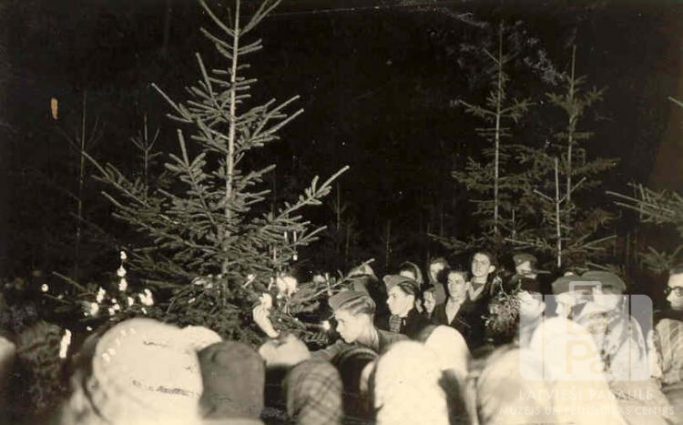 Gaidu un skautu vadītāju sagatavošanas kursi pie Traunšteinas (amerikāņu zonā) no 1950. gada 2. līdz 8. janvārim. Cilvēku grupa vakarā iekarina tievā, vairākus metrus garā eglē sveces. Pie egles stāv jauns puisis formastērpā. Fonā ir egļu jaunaudze.