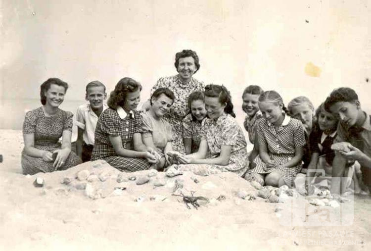 Klavierskolotāja ar saviem audzēkņiem no Lībekas (angļu zonā) sēž smiltīs izbraukumā pie Baltijas jūras. Priekšā smiltīs ir akmeņi. Fonā ir jūra. Priekšā, no kreisās: nezināms, Arnis Mikus, Biruta Mikus, Marija Jesčenko, Aina Prauliņa, Vija Blumfelde (pr. Mangule), Biruta Trešcinska, Ruta Lāma, nezināms, Ilga Nātre un Guntis Nātre. Aizmugurē: ? Hess (skolotāja, pianiste).