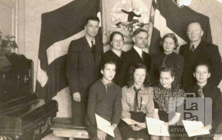 Skolotāji un absolventi Valderzē nometnes Lībekā (angļu zonā) pamatskolas izlaidumā. Priekšā uz koka sola sēž četri skolēni ar dokumentiem rokās, pieci skolotāji stāv aizmugurē. Kreisajā pusē ir klavieres. Fonā uz sienas ir divi Latvijas Valsts karogi, starp kuriem ir izrakstīts attēls ar dejotāju pāri. Pirmajā rindā, no kreisās: Kārlis Riekstiņš, Vija Blumfelde (pr. Mangule), Ilona Leimane un Indulis Liepiņš. Otrajā rindā, no kreisās: Arnolds Brīvulis (skolotājs), Izanda kundze, Kārlis Izands (skolas pārzinis), Elizabete Liepiņa un ? Vinters.